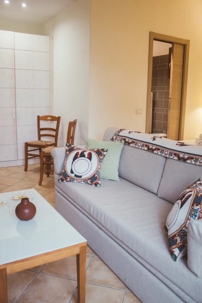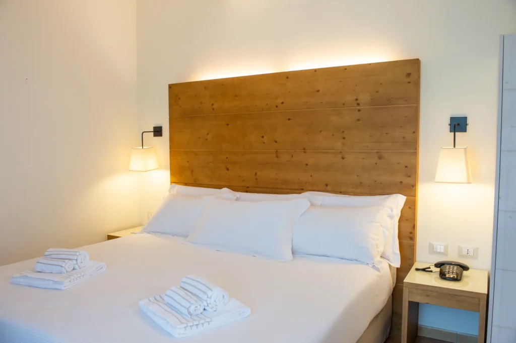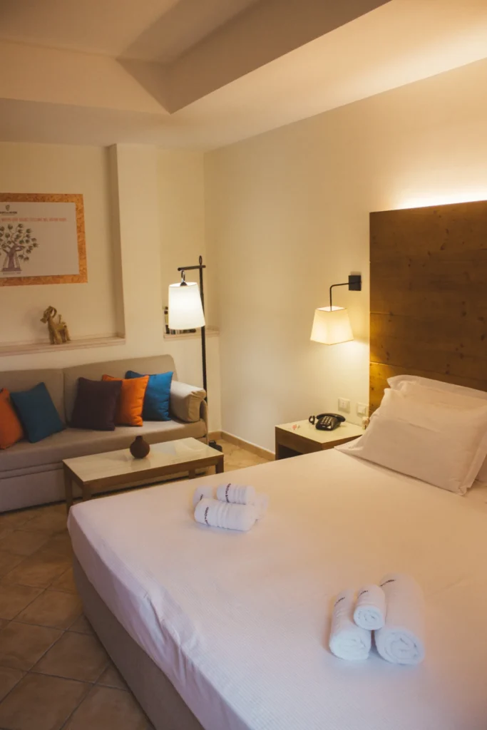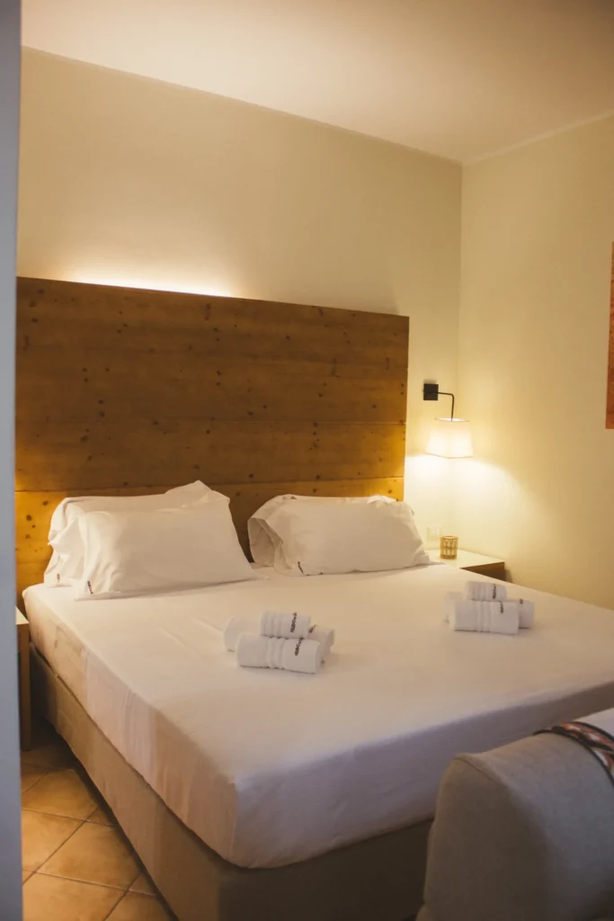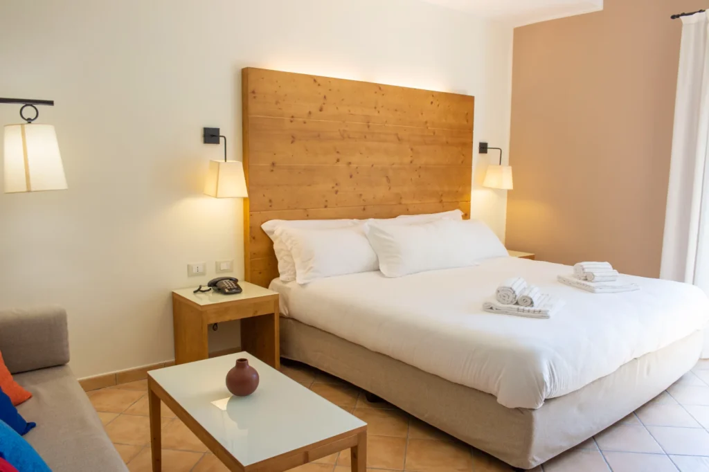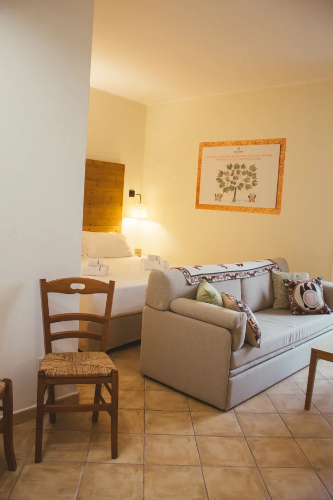 La Camera Deluxe è una camera ampia e confortevole, caratterizzata da un ampio open space, che diviene anche la zona soggiorno dell'ambiente, in cui si trova un comodo sofa trasformabile in letto. E' la scelta ideale per chi desidera più spazio per sé e apprezza circondarsi di essenze di legni preziosi e opere d'arte, anche in vacanza. La Camera Deluxe può accogliere, all'occorrenza tre ospiti.