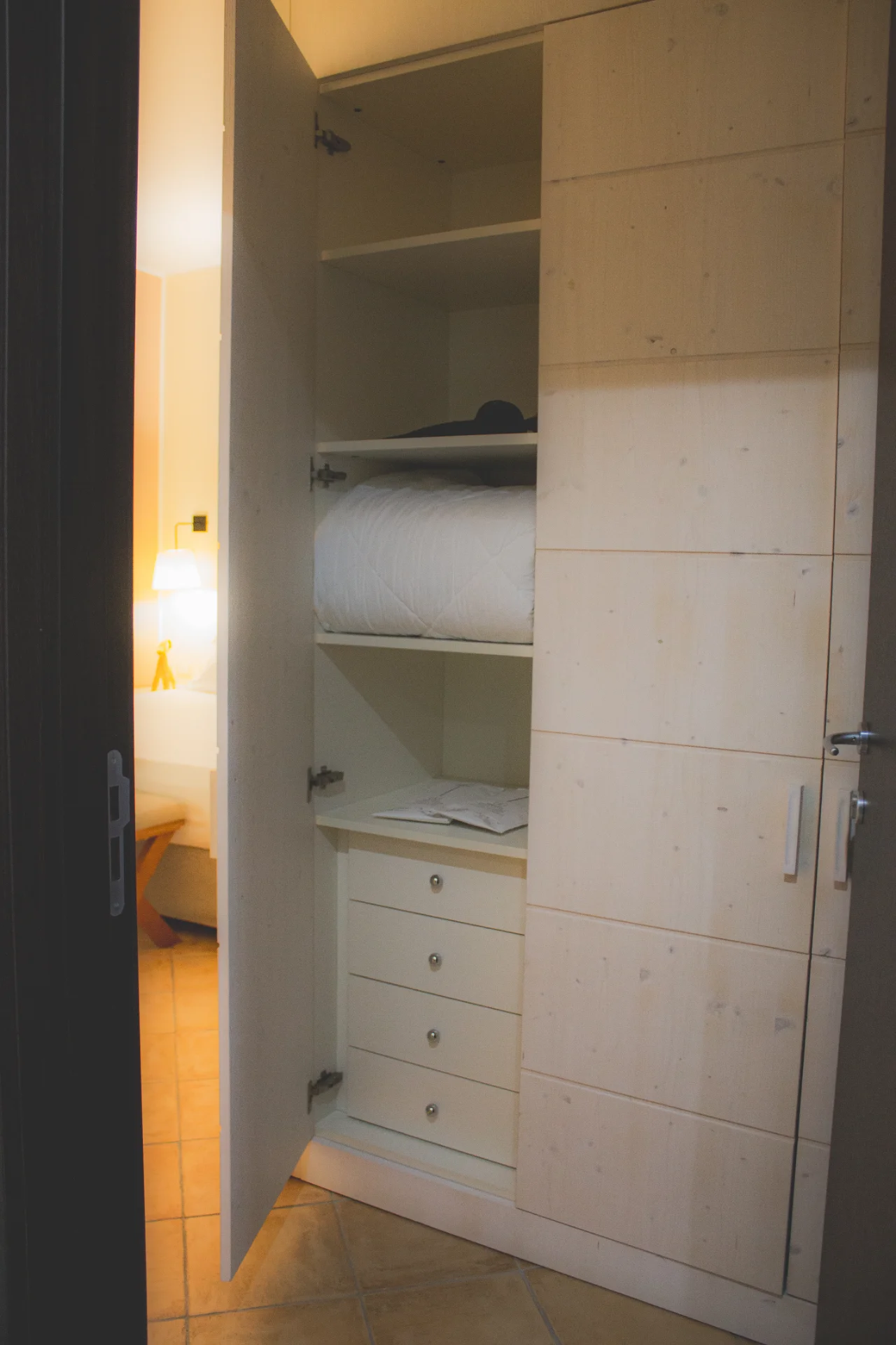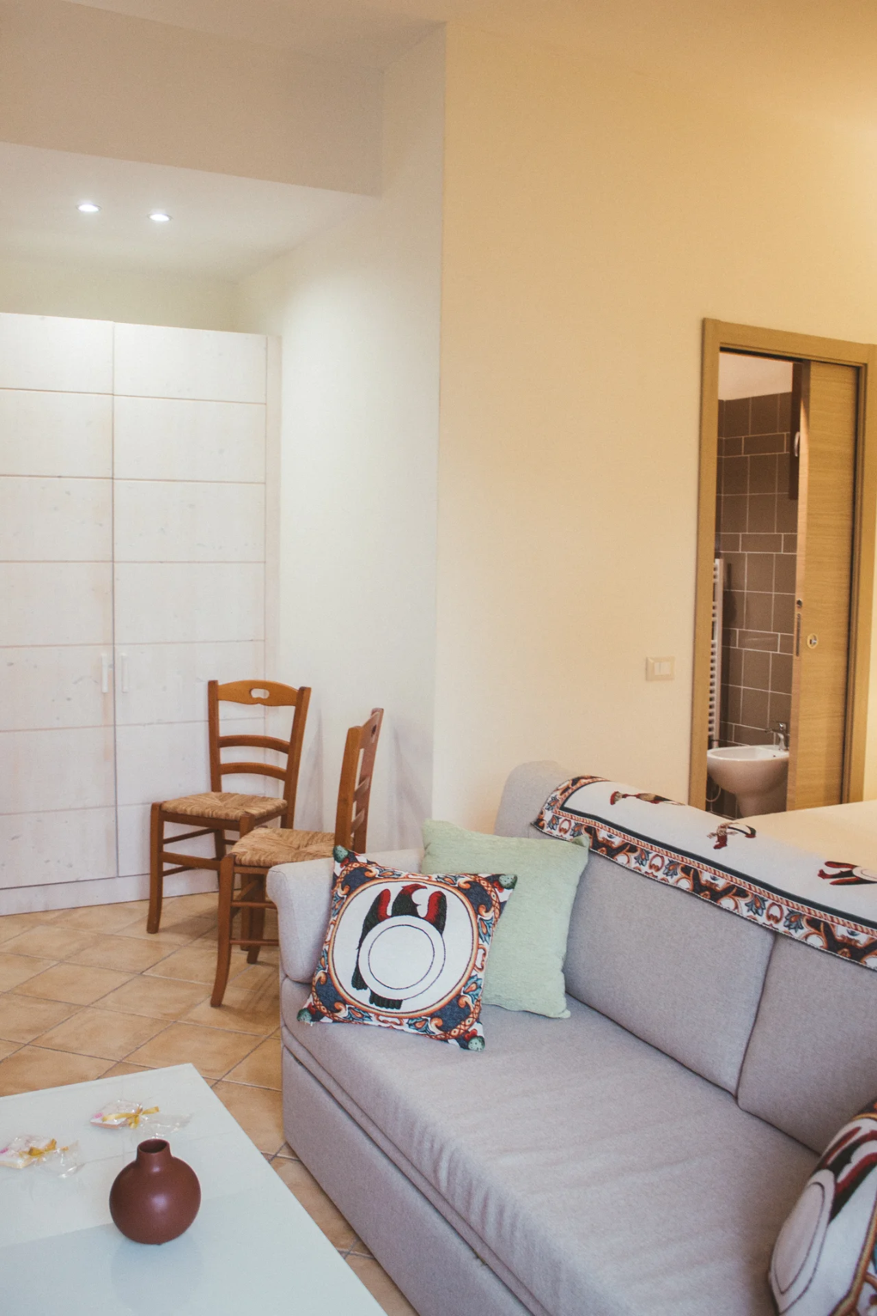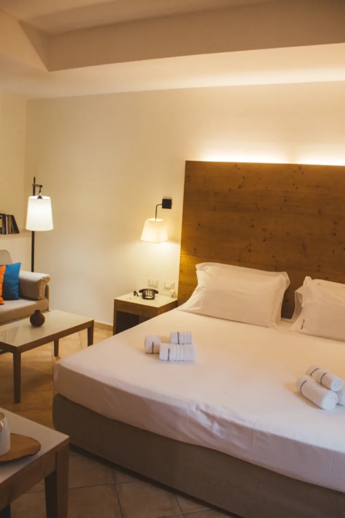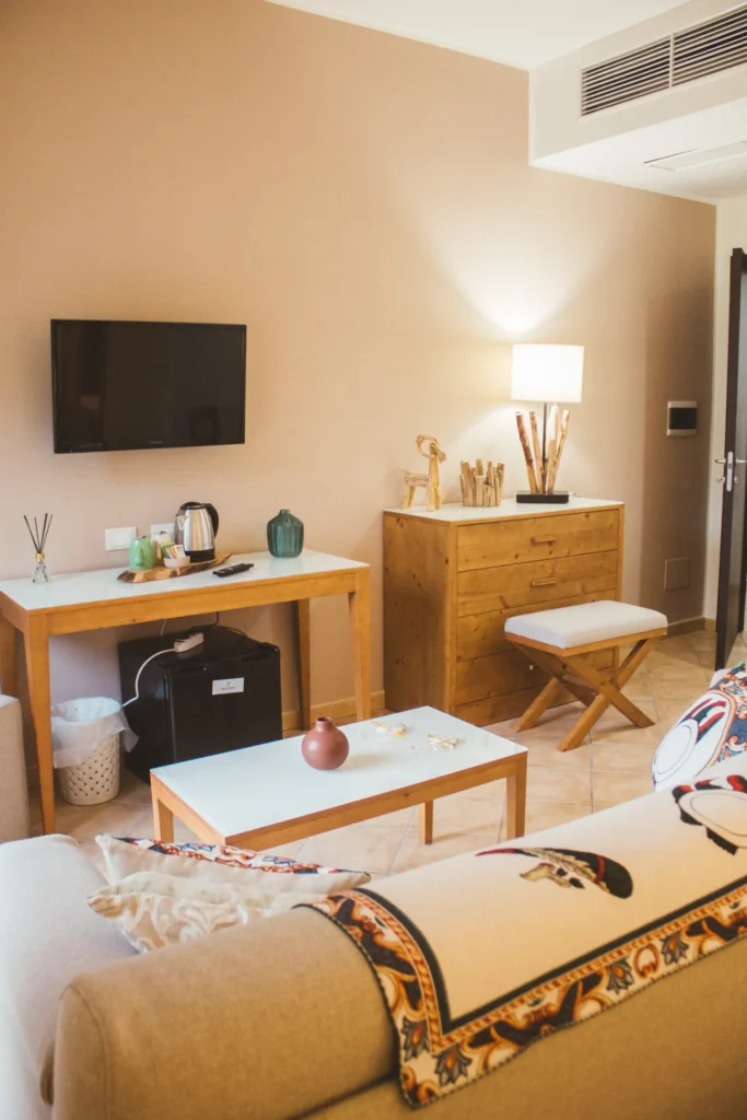 La Camera Deluxe è una camera ampia e confortevole, caratterizzata da un ampio open space, che diviene anche la zona soggiorno dell'ambiente, in cui si trova un comodo sofa trasformabile in letto. E' la scelta ideale per chi desidera più spazio per sé e apprezza circondarsi di essenze di legni preziosi e opere d'arte, anche in vacanza. La Camera Deluxe può accogliere, all'occorrenza tre ospiti.